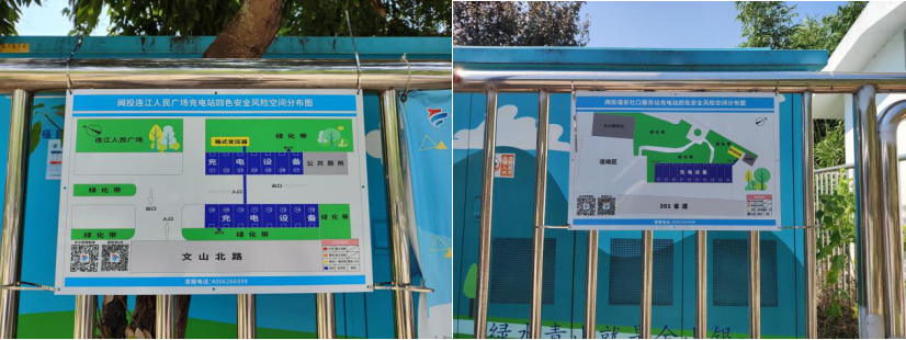 在公司安委会的监督和指导下,各分公司和工作组认真排查全省充电场站,对每个场站进行安全风险分类梳理,明确风险点,风险类型,评定安全风险等级,排查安全隐患,绘制安全风险四色分布图悬挂于明显位置。同时,梳理优化隐患排查步骤和风险分级管控流程,明确职责分工,努力做到“固底板、补短板”。